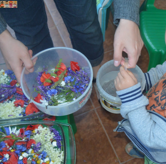 Nazbieraliśmy sobie do pudełeczka kwiatów, po czym w domu wrzuciliśmy wszystkie do prostokątnych pojemników, kolejny raz utrwalając nazwy. Zalaliśmy wodą i wstawiliśmy do zamrażarki.
